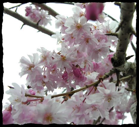Looking Up at the Beauty of Spring at the Stratham Circle Nursery Double Weeping Flowering Cherry After a Fresh Spring Rain |